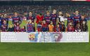 Antes del inicio del partido, un grupo de jóvenes de la Asociación Catalana de Síndrome de Down se han hecho una foto en el césped con los jugadores del FC Barcelona.