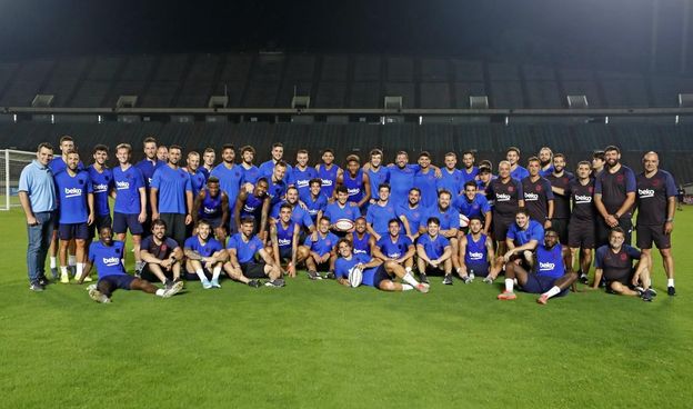 Este jueves por la tarde, coincidiendo con la finalización del segundo entrenamiento del día del primer equipo de fútbol, se ha llevado a cabo una de las fotografías de la gira. Ha sido la instantánea que ha unido al equipo de Ernesto Valverde con el Barça Rugby.