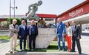 Emotivo homenaje a Ladislau Kubala en la explanada del Camp Nou. El presidente Joan Laporta, acompañado por el directivo Josep Ignasi Macià, el asesor a la presidencia Enric Masip, la directora de la Agrupació Barça Jugadors Meritxell Solé, el presidente de la Agrupació Ramon Alfonseda y el director del Museo Jordi Penas, han ofrecido un ramo de flores a la estatua de la leyenda húngara el día que se cumplen 20 años de su muerte.