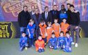 Los tres jugadores, acompañados del técnico, Felipe Ortiz, y los directivos de la comisión deportiva del Barça B han pasado un rato con los niños
